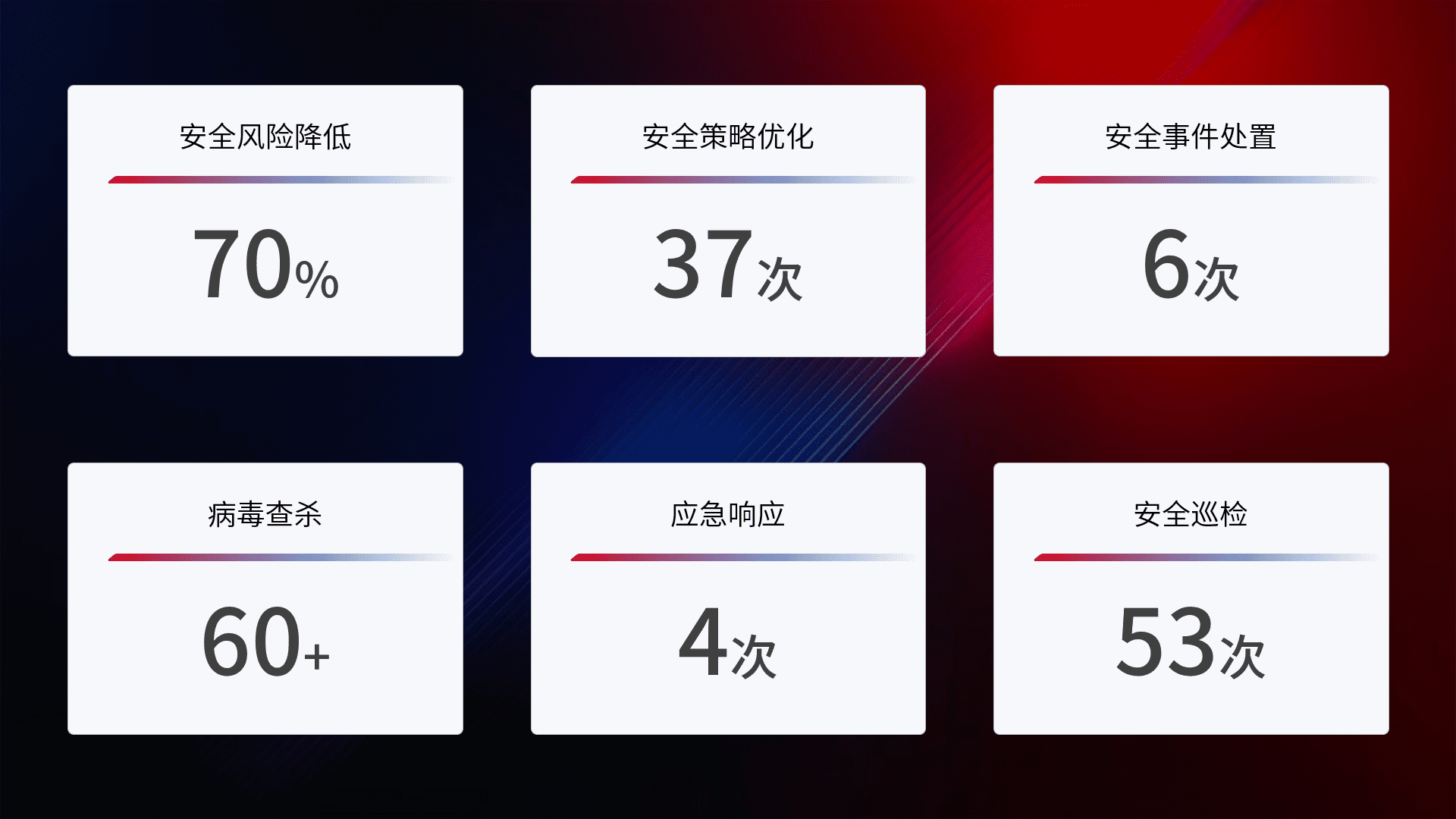 提供全面的安全事件报告体系,,,包括处置报告、、、周报、、、季度和年度总结,,,,结合持续监控,,,,帮助客户深入了解网络安全状况。。。。
